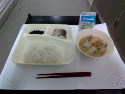 今日は「さごしのしょうゆだれかけ、みそ汁、黒豆の煮もの、ごはん、牛乳」でした。さごしは塩で下味をつけてこんがり焼き、手作りのしょうゆだれをかけたごはんによく合いました。それと豚肉のうまみもでていた具だくさんのみそ汁とおせち料理の黒豆の煮ものでした。