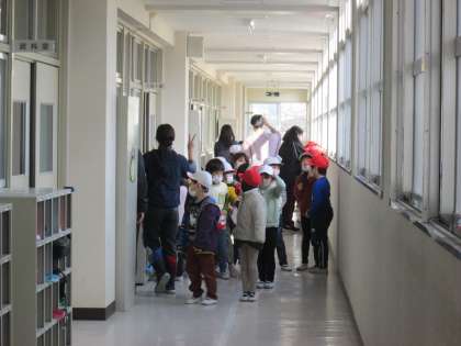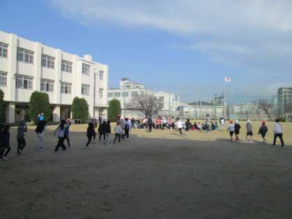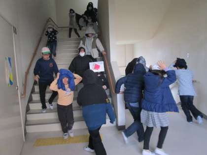 十三小学校では先週、学級休業のクラスがあったため、延期をして地震・津波の避難訓練を実施しました。非常ベルが鳴るとすぐに机の下に入って、身体の安全を確保します。その後、地震が落ち着いてから運動場への避難を行いました。