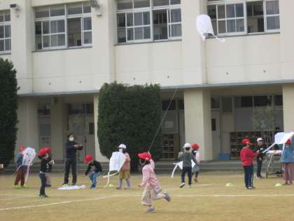 「せ〜の!」と合図の声をかけて走り出すと、ペアのお友達が凧をもつ手をパッと放します。子ども達が勢いよく走ると、少し寒い空気をいっぱい受けて、風がグングンと上昇していきました。
