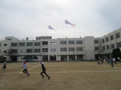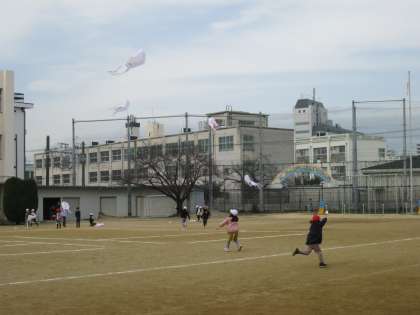 アッという間に凧はバスケットボールよりも高く、校舎の2階ぐらいまで上がっていきます。凧がふわりと着地すると子ども達は糸を巻き取って、ペアのお友達とで役割を交代します。授業の終わりまで、ペアで交代して何度も凧あげを楽しみました。