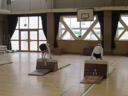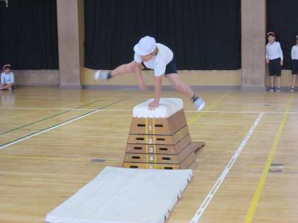 跳び箱の開脚跳びの記録会の後は、少しレベルアップして抱え込み跳びに挑戦しました。助走の勢いをいかして両足でしっかり踏み切った瞬間、膝が胸につくように両足を引き寄せます。タイミングよく抱え込むと、跳び箱を軽く跳び越えることができました。