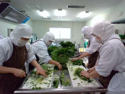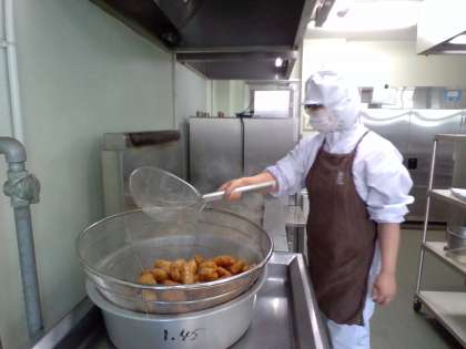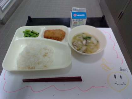 今日は「たらフライ、すまし汁、こまつなのごまあえ、ごはん、牛乳」でした。たらフライは一人一切で、少し塩味がありサクッとして人気がありました。すまし汁はこんぶとかつおのだしがよくきいた上品な味のすまし汁でした。それと、旬のこなつなのごまあえでした。どれもごはんによく合い、よく食べていました。