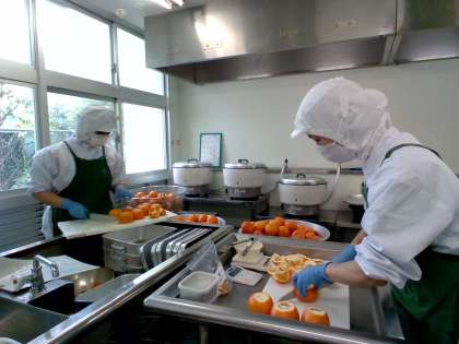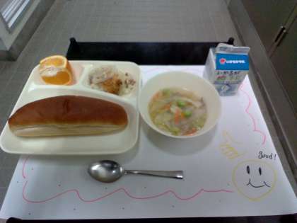 今日は「押麦のグラタン、豚肉と野菜のスープ、いよかん、黒糖パン、牛乳」でした。押麦のグラタンは、食物繊維やミネラル、ビタミンなどが豊富に含まれている押麦を使い、表面をカリッと焼き上げました。それと具だくさんのスープは、あっさりと仕上げられて、グラタンによく合いました。いよかんは、みずみずしく、甘酸っぱく、旬を感じるくだものでした。