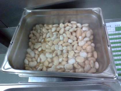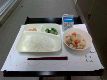 今日は「関東煮、きゅうりの梅風味、白花豆の煮もの、ごはん、牛乳」でした。関東煮は鶏肉を主材にうずら卵、ちくわ、じゃがいも、だいこん、こんにゃくなと、具だくさんの定番の煮ものでした。きゅうりの梅風味は、あっさりと歯ごたえのよく食べやすい味付けでした。白花豆の煮ものは大粒の白花豆をあまくやわらかい煮豆でした。
