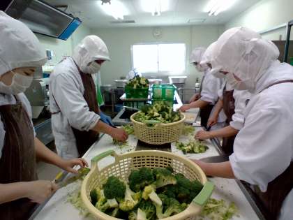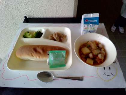 今日は「鶏肉のバジル焼き、ケチャップ煮、ブロッコリーのサラダ、コッペパン、りんごジャム、牛乳」でした。鶏肉のバジル焼きは、バジルの風味よく焼き上げた鶏肉、それにパンによく合うケチャップ煮、旬のブロッコリーを使ったサラダでした。