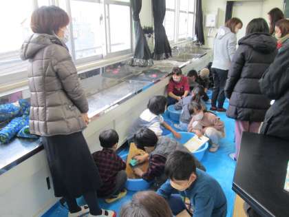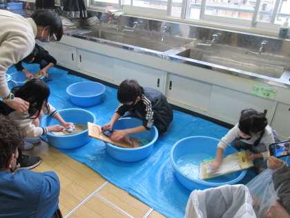 3年生は社会で学習してきた「昔のくらし」から、昔の道具体験をしました。大きなタライに水を入れて、洗濯板とせっけんで靴下を洗います。気温のあたたかい日でしたがやはり2月なので、洗濯をしている子ども達は「つめたぁい!」と口々に言っていました。
