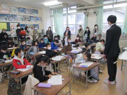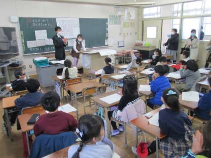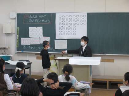 2年生は算数で掛け算の発展問題にチャレンジしました。これまでは「かけられる数×かける数」で九九を覚えてきましたが、大きな紙に並んだ○は九九だけでは数を求めることができません。