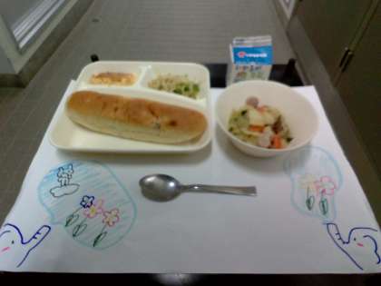 今日は「ポトフ、カレーソテー、焼きプリン、おさつパン、牛乳」でした。ポトフは牛肉をよく煮込み、さらに野菜と一緒に煮込んだやさしい味のポトフでした。カレーソテーは、鶏肉、もやし、ピーマンをカレー味で仕上げたソテーでした。もやしの黒いところを給食調理員さんはていねいに手作業でとってくれました。(写真上)焼きプリンは、鶏卵、さとう、牛乳、生クリームだけで作った手作りのプリンでした。(写真中)カラメルソースも手作りで、市販のプリンとは違う素朴な味で好評でした。