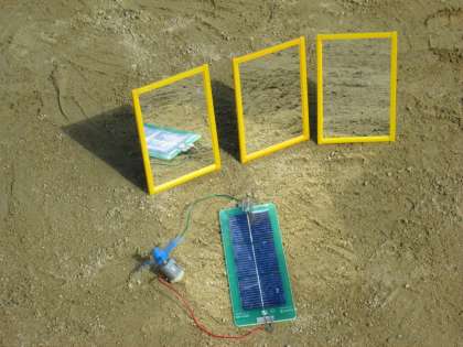 光電池に太陽の光が当たると、モーターについたプロペラが回転します。また、鏡を使って光電池に光を集めると、さらにモーターが速く回り出してキュルキュルと音がなるほどです。