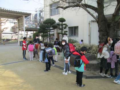 列の先頭に並ぶ6年生が下級生をまとめて下校しました。6年生のみなさん、地区別児童会の活動も一年間ありがとうございました。