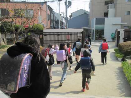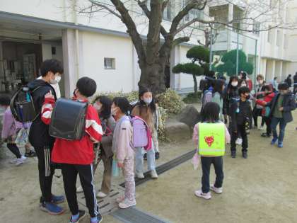 地区別児童会の集まりでは、最後に集団下校をします。災害や不審者対応などのときに、近所に住む子ども達を集めて安全に下校をするための練習です。