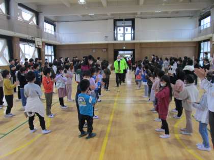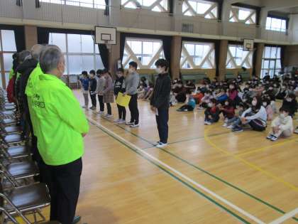 今年度の登校も来週末までになりました。見守り活動をしてくださっているみなさんをお招きして、『見守り感謝の会』を開きました。児童朝会の時間に来てくださった方々を、全校児童が拍手でお迎えします。まずは、十三小学校の子ども達を代表して児童会の5年生がお礼の言葉をスピーチし、子ども達が書いたお礼の手紙をお渡ししました。