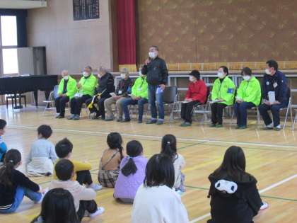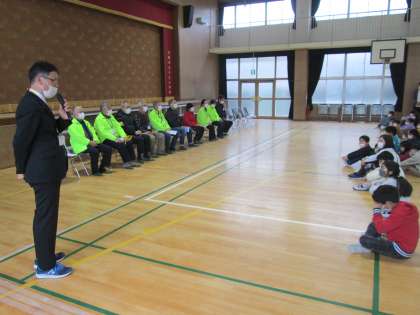 次に、子ども見守り隊とセーフティー淀川のみなさんに、ご挨拶をしていただきました。「私も60年前に十三小学校を卒業しました。十三小学校はとっても素晴らしい学校です。」、「登下校の時にみなさんのあいさつを聞くと、私たちも元気をもらえます。これからも私達に『おはようございます』とあいさつを返してくれると嬉しいです。」など、心温まるメッセージをいただきました。