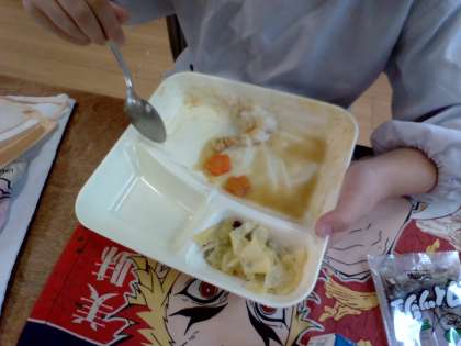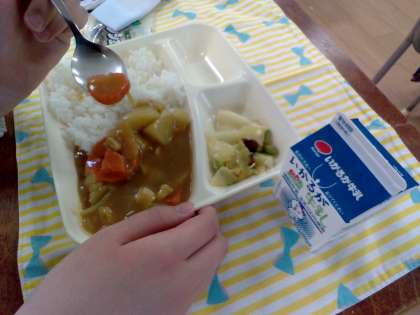 今日は今年度最後の給食でした。チキンカレーライスにはたくさんのラッキーにんじんをが入りました。どのクラスもラッキーにんじんで盛り上がっていました。