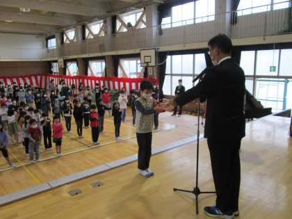 また、後期に読書をがんばった児童が舞台に上がり、校長先生から『読書名人』の認定証が授与されました。今年度もたくさんの読書名人がうまれました。