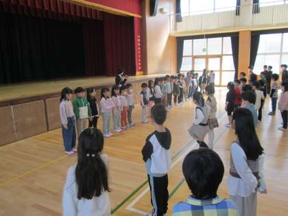 たくさんの上級生を前にして、並んだ1年生の子ども達は少し緊張した様子でした。担任の先生がお話をして、1年生のみんなで「よろしくお願いします。」と声をそろえてあいさつをしました。