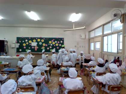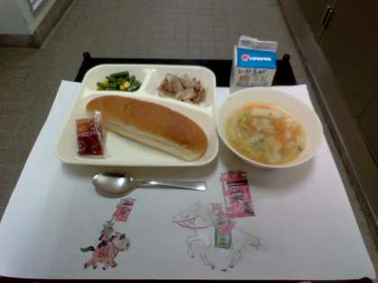 今日は「豚肉のガーリック焼き、スープ、さんどまめとコーンのサラダ、コッペパン、いちごジャム、牛乳」でした。4月に入り、新たまねぎ、新キャベツといつもより水分たっぷりで柔らかい野菜が食材として入ってきます。それに合わせて、給食調理員さんたちは工夫しておいしくなるように調理をしています。