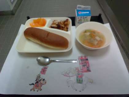 今日は「じゃがいものミートグラタン、レタスのスープ、みかん(缶)、黒糖パン、牛乳」でした。