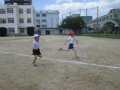 準備運動でしっかりと体をほぐしてから、運動場に引かれた白線に沿って50m走をしました。「よぉい、ピッ!(笛)」の合図を聞いて、ゴールの線を目がけて駆けだします。ペアのお友達と笑顔でかけっこを楽しんでいました。