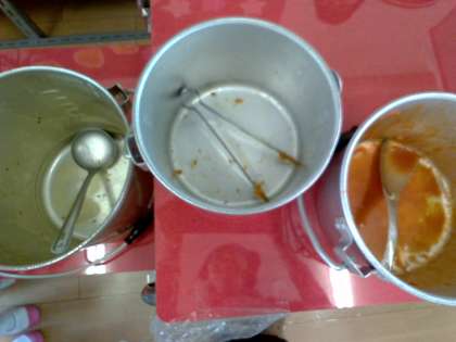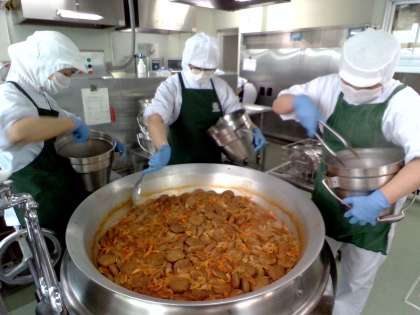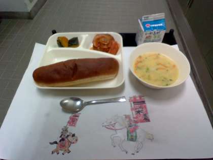 今日は「煮こみハンバーグ、コーンとキャベツのスープ、焼きかぼちゃ、黒糖パン、牛乳」でした。煮こみハンバーグはケチャップ味のソースでじっくりと煮込まれ、パンにもよくあい好評なおかずでした。スープはキャベツが入ったコーンスープでボリューム感がありました。今日も一年生はよく食べていました。(写真上)