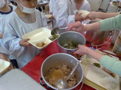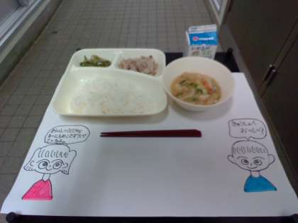 今日は「豚肉のしょうが焼き、みそ汁、じゃこピーマン、ごはん、牛乳」でした。どのおかずもごはんによく合い、よく食べていました。1年生は「ピーマンおいしい〜」「おかわり!」(写真上)と今日も食缶は空っぽになりました。(写真中)頼もしい十三小学校の1年生たちです!!