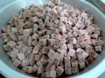 今日は「まぐろのオーロラ煮、豚肉と野菜の煮もの、キャベツの赤じそあえ、ごはん、牛乳」でした。まぐろはサイコロ状の冷凍のものが届き(写真上)、それにしょうがと酒で下味をつけ、でんぷんをまぶして油れ揚げます。オーロラソースはケチャップ、赤みそ、砂糖(写真中)で作ったソースでからめます。人気のあるおかずです。