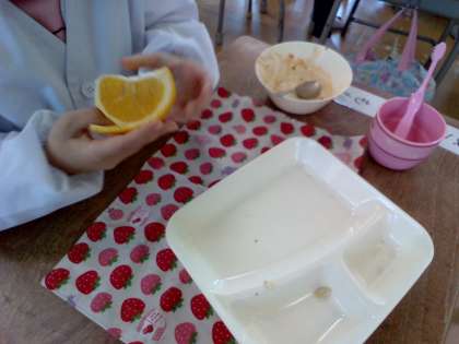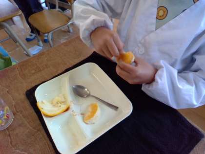 今日はデザートにあまなつかんが登場しました。1年生のあまなつかんはむきやすいように少し切り目を入れてくれました。1年生の中では、初めてむくという人もいました。その様子を見てください。