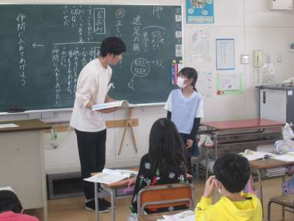 授業の中にロールプレイングを取り入れ、一人ぼっちのお友達(担任の先生)に優しく声をかける場面を3年生の子ども達が演じました。ロールプレイングの後、主人公の役を演じた子に担任の先生が気持ちを尋ねると、「いっしょのグループになれて気持ちがスッキリした。」や「仲間はずれにするのはいけないと思ったから声をかけました。」と発表をしてくれました。