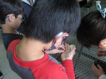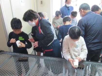 前日の雨はやんだものの2限目はまだ風が強かったので、講堂の入り口に大きなテーブルを並べて作業をしました。3年生の子ども達は前後半のグループに分かれて、育苗ポットの中に、マリーゴールドの種を一つ一つ入れていきます。種がこぼれないように気をつけながら、竹ひごの先を上手に使って丁寧に作業をしていました。