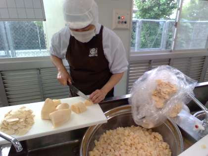 今日は「きびなごてんぷら、豚汁、わかたけ煮、ごはん、牛乳」でした。わかたけ煮(写真下)は今が旬のたけのこ(写真上)とわかめ(写真中)を使った煮ものです。やさしいだしの味で、旬を感じる一品でした。