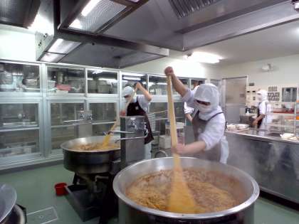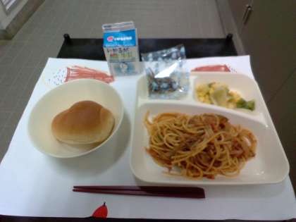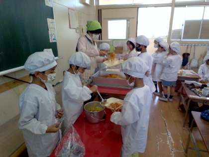 今日は「ミートソーススパゲッティ、レタスとコーンのサラダ、ミニフィッシュ、黒糖パン1/2、牛乳」でした。スパゲッティは給食でも人気のある献立で、今日も1年生は空っぽにするぞ!とおいしそうに食べていました。1年生は給食の準備も手際よくなってきています。(写真下)