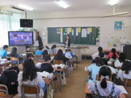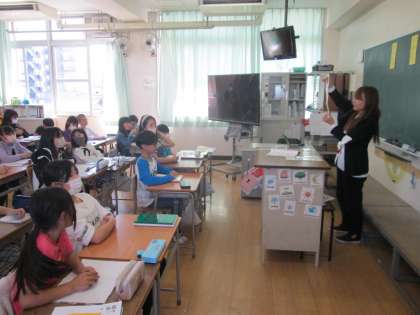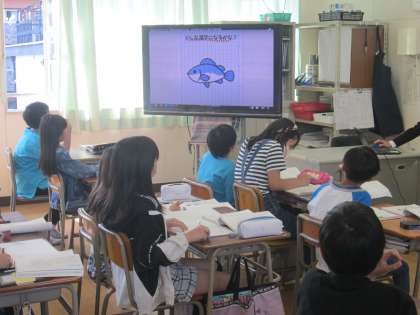 5年生の学習参観では授業の後半に、小学校に入学してから習った漢字を使って漢字クイズをしました。指示文字、会意文字、形声文字の成り立ちについて、楽しみながら理解を深めることができました。