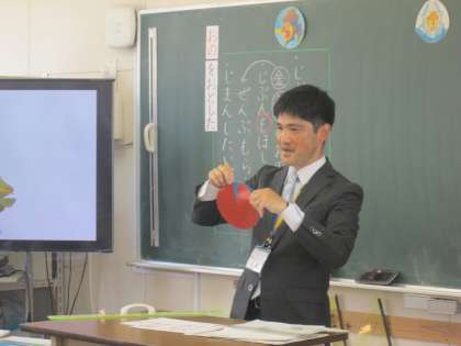2年生の子ども達が学習参観の道徳科で読んだのは、有名なイソップ童話の『金のおの』です。ある日、木こりが大切な斧を泉に落としてしまいます。すると泉の中から神様があらわれて、木こりに「落としたのは金の斧か、銀の斧か」とたずねます。