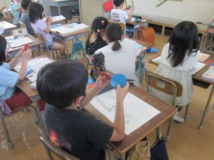 「大切な斧を落としてしまったときの木こりの気持ちを表してみましょう。」と担任の先生が言うと、2年生の子ども達はさっと赤い円と青い円を出しました。2つの円には切れ込みが入っていて、組み合わせると赤と青の面性が変わるようになっています。