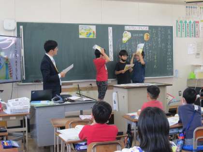 今年度の研究授業の1回目は2年生で、「およげない りすさん」という教材を使って行いましや。あひるとかめと白鳥が、池の中の島へ行って遊ぶ相談をしていました。そこへ、りすがやって来て、「ぼくも一緒に連れて行ってね。」と頼みます。しかし、あひるとかめと白鳥は「りすさんは、泳げないからだめ。」と断って、りすを残して島へ泳いで行ってしまいます。島に着いたみんなはりすのことが気がかりで、楽しく遊べませんでした。次の日、みんなは昨日のことをりすに誤り、りすをかめの背中に乗せて島に渡って遊びました。