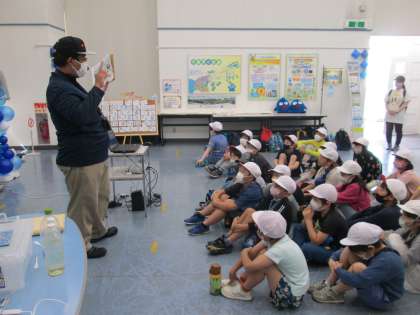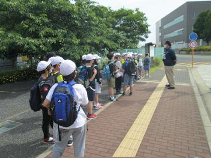 4年生は社会見学で柴島浄水場を訪れました。西中島南方駅のを越えて10分ほど歩くと、柴島浄水場の門が見えてきます。始めに今日、見学の案内をしてくださる職員の方にご挨拶をして、見学のきまりについてお話を聞きました。
