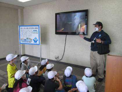 水の中のゴミをとっただけでは、まだ飲料水として使うことはできません。大阪市の浄水場では高電圧で発生させたオゾンを使って有機物質を分解し、0.5mmの細かい砂の間を通して濾過しているそうです。「最後には粒状活性炭に水を通して、炭に空いている細かな穴で匂いや細かなゴミも取り除きます。」とお聞きして、何回も重ねて水をきれいにする工程に子ども達は感心していました。