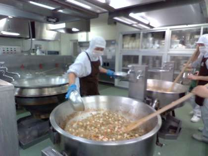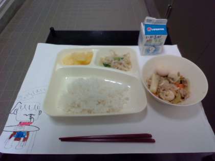 今日は「八宝菜、チンゲンサイともやしのしょうがあえ、パインアップル(カット缶)、牛乳」でした。八宝菜は豚肉、うずら卵(写真上)を主材に、キャベツ、たけのこ、にんじん、ピーマン、しいたけとたくさんの野菜を使いました。とろみがついて、(写真中)ごはんによく合いました。