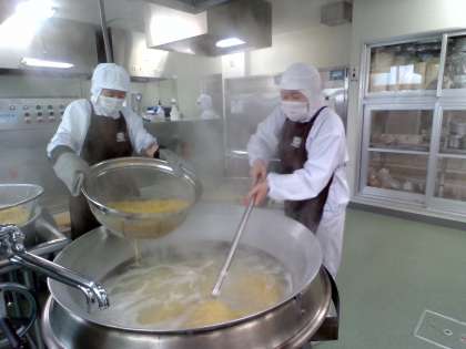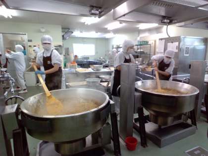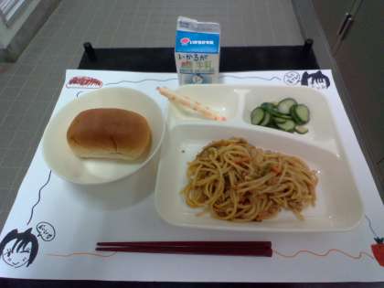今日は「カレースパゲッティ、きゅうりのピクルス、棒チーズ、黒糖パン1/2,牛乳」でした。カレースパゲッティはカレー粉、カレールウを使ったスパイシーなカレー味のスパゲッティでした。カレー味につけた具材の中に茹でたスパゲッティを加え、混ぜ合わせるのは大変な調理作業です。