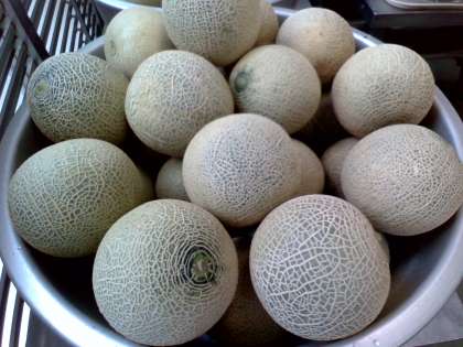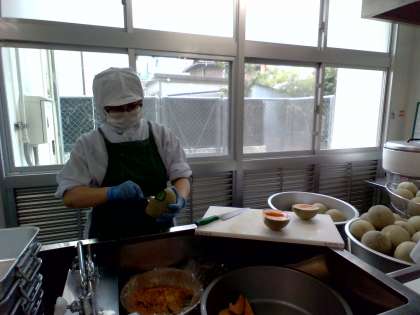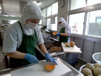 今日は、年に一度だけ登場するクインシーメロンがつきました。メロンが苦手な児童もいましたが、「やったー!メロンや!」と喜ぶ児童がたくさんいました。今日のメロンは茨城県産のメロン(写真上)で、給食室できれいに種を取り除き(写真中)、8分の1に切り分け(写真下)ました。
