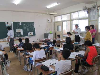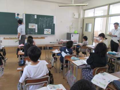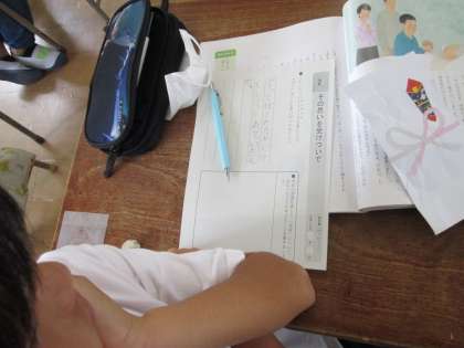 研究授業では先生がしわくちゃになったのし袋を配ると、6年生の子ども達はのし袋を持ち、じっと目つめていました。そこに書かれていたじいちゃんのメッセージを想像して、じいちゃんの孫への愛情を感じとったり、そののし袋を手にした「ぼく」が受け取った思いについて考えました。