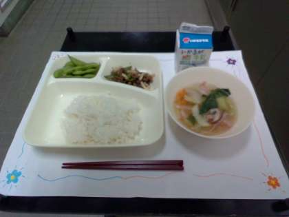 今日は「チンジャオニューロウスー、ハムと野菜の中華スープ、えだまめ、ごはん、牛乳」でした。チンジャオニューロウスーは牛肉、ピーマン、たけのこを使用し、濃口しょうゆ、オイスターソースなどで味をつけた、ごはんによく合うおかずでした。はるさめが入ったスープは、はるさめを好きな児童が多く人気がありました。夏が旬のえだまめは、豆が苦手な児童にも食べやすい豆の種類のようで、よく食べていました。