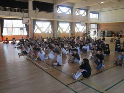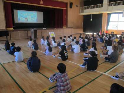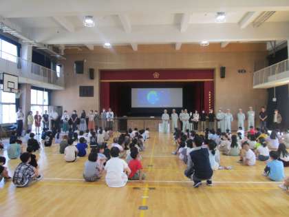 コロナ禍もすぎ3年ぶりに十三地域活動協議会と、地域防災リーダーのみなさんの協力をいただいて『防災学習デー』を実施しました。講堂に集まった全児童の前に、十三地域活動協議会と地域防災リーダーのみなさんに並んでいただき、校長先生と一緒に朝のご挨拶をしてスタートしました。
