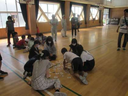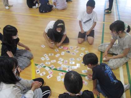 5年生と6年生は講堂でグループに分かれて、『防災トるた』を使った防災学習をしました。『防災トるた』は2年ほど前に、十三地域活動協議会のみなさんが企画してつくられました。トランプとかるたの要素を合わせたもので、カードには子ども達から募集した防災に関するメッセージが書かれており、かるたとして遊んで学ぶことができます。