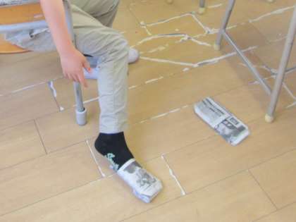 できた紙スリッパに足を入れて、ニッコリ笑顔の2年生でした。