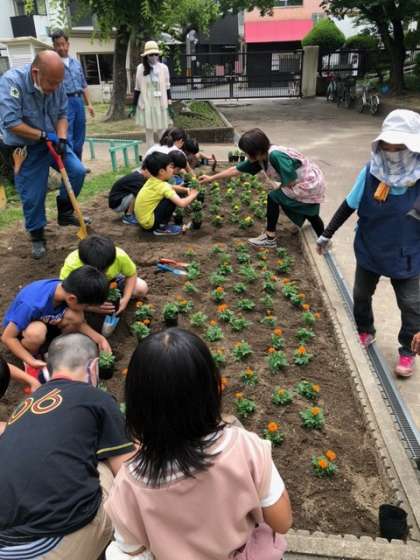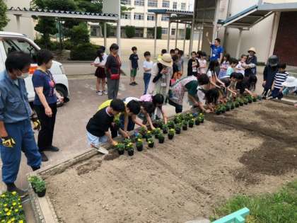 5月30日に育苗ポットに植え替え、「鉢上げ」を行ったマリーゴールドの苗は、葉がたくさん生え、ちいさくかわいいい花を咲かせていました。夢ちゃん花づくりの3回目本年度最終回の活動は、「植付」です。