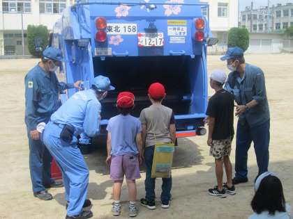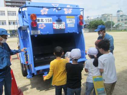 次にパッカー車の荷台にゴミを放り込む体験をさせていただきました。班ごとに小さなゴミの袋を投げ入れて、荷台の中で羽が回ってゴミを奥に送るところを観察しました。