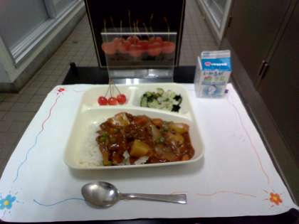 今日は「ハヤシライス、ミックス海草のサラダ、さくらんぼ、牛乳」でした。今日はデザートに年に一回だけ登場する「さくらんぼ」でした。今日のさくらんぼは、山形県産の佐藤錦で、甘酸っぱくておいしいものでした。児童の中で「この種植えたらさくらんぼできるかな」というかわいい声を聞きました。