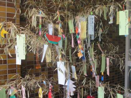 小学校の玄関で笹の葉と色とりどりの短冊、折り紙でつくった飾りが風に吹かれて揺れています。今週の金曜日は7月7日、七夕です。