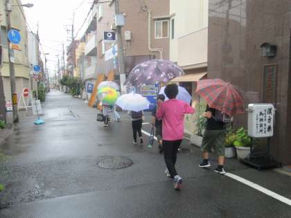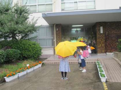 地区別児童会で夏休みのくらし方について話し合った後、集団下校をしました。お昼前から雨が降り出したため、傘をさして道路に広がらないように気をつけて帰ります。